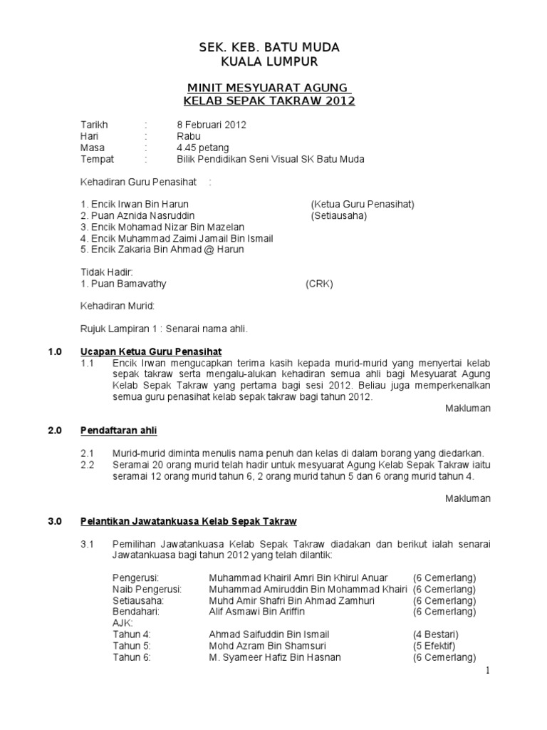 Minit mesyuarat ialah catatan berkenaan apa yang telah dibincangkan atau dipersetujui dalam mesyuarat. Didalam sistem pendidikan di sekolah, terdapat pelbagai jenis mesyuarat yang bakal diadakan. Nik amir naim bin nik ahmad kamal setiausaha, persatuan bulan sabit merah, srk seri indera, kangar. Setiausaha penaja melaporkan bahawa aktiviti yang. Tatacara mesyuarat agung tahunan persatuan/kelab pelajar 2018— presentation transcript 3 persatuan/kelab perlu mengemukakan permohonan kepada bhep untuk mengadakan mesyuarat agung tahunan tersebut berdasarkan kaedah yang. Ucapan ydp sesi 2014/2015 6. Bendahari penaja mengumumkan kewangan persatuan setakat 01 januari 2010 berjumlah rm 150.00 5. Kemudian minit dalam minit adalah aplikasi untuk anda. 7 januari 2016 (khamis) masa : Contoh minit mesyuarat bulanan persatuan mp3 & mp4. 30 mac 2015 9 jamadil akhir 1436 (isnin) masa : Perbi perbinca ncanga ngan n tentan tentang g minit minit me mesyu syuara aratt yang lalu dibuat secara ringkas. [ sebarang sumbangan bahan pendidikan, masalah, aduan, keperluan dan perkara berkaitan laman web (website) boleh hubungi kami di emel.