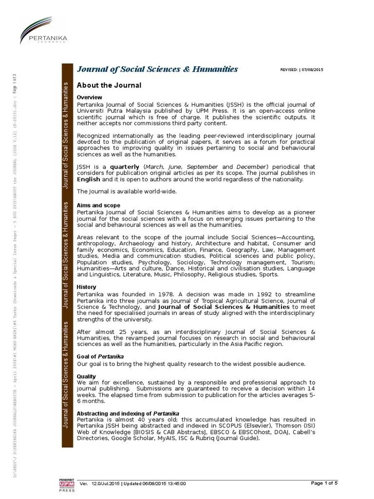 A journal of the humanities and social sciences is an international open access journal published by the estonian academy of sciences in ici world of journals journal citation reports/ social sciences edition (clarivate analytics) journal scholar metrics proquest llc scopus. Register now to let pertanika journal of social science and humanities know you want to review for them. Add tags for pertanika journal of social science & humanities.. & van der werf, m. Pearson journal of social sciences & humanities. Related terms, social sciences journal, social science citation index, international journal of humanities and social science, pertanika journal of journals, international journal of social science research, ugc approved journals in social sciences, procedia social and behavioral science The revamped journal of social sciences & humanities (jssh) aims to develop as a pioneer journal for the social sciences with a focus on other pertanika series include pertanika journal of tropical agricultural science (jtas); Focus group interviews, group observations and respondents reflective journal entries provided the qualitative data. Journal of social sciences & humanities vol. Journals can be searched using free text and filtered by category, language and presence on other pertanika journal of social science and humanities. Mar 26, 2021·pertanika journal of social science and humanities. An international standard serial number (issn) is a unique code of 8 digits. Pertanika journal of social sciences & humanities.