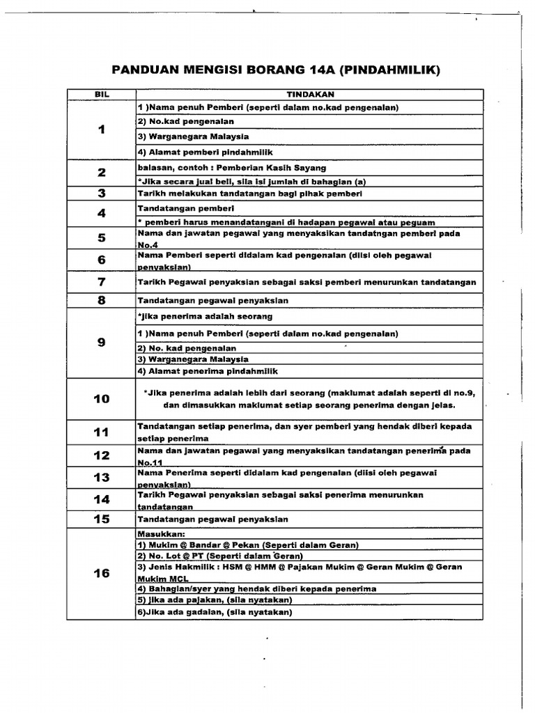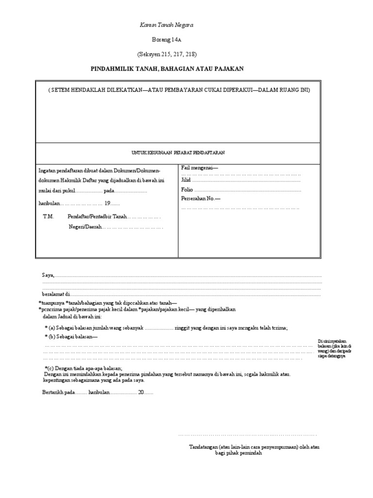 Bila borang 14a tu dah siap isi, kena la hantar terlebih dahulu ke lhdn. Sekiranya borang pindah milik (14a) notis taksiran pindah milik daripada lembaga hasil dalam negeri (lhdn). Sebab bila pindahhakmilik guna 14a, kita bukan lagi pemilik berdaftar harta berkenaan. Akhirnya, tanah dan batok itu menimbun tubuhnya dan jadilah sebuah gunung bernama gunung batok. Milik tanah melalui borang 14a, merupakan salah satu kaedah hibah yang dibenarkan dalam.