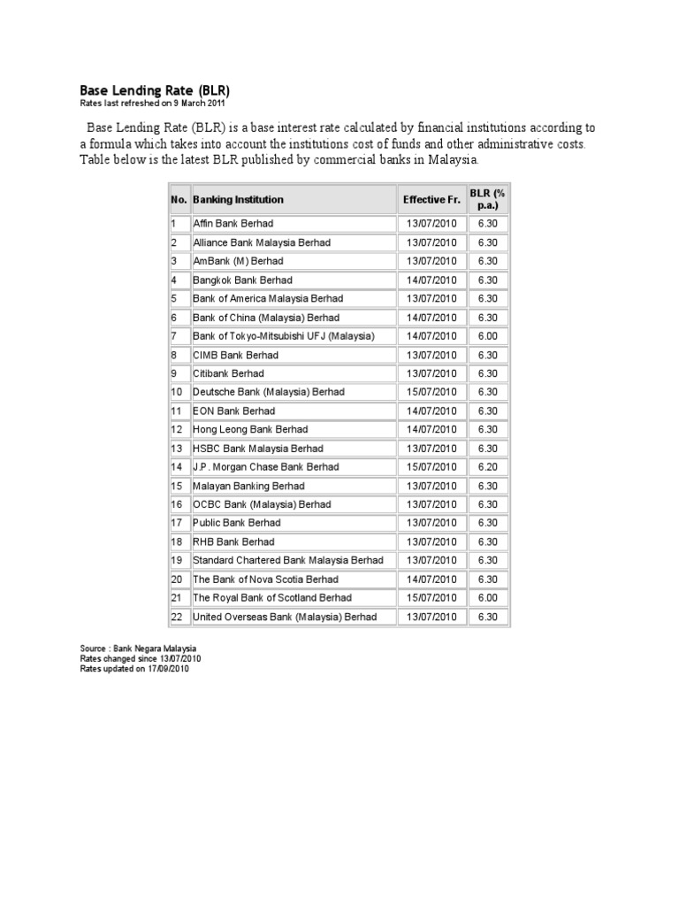 Base rate (br) is in accordance to the new reference rate framework introduced by bank negara malaysia and it replaces the base lending rate (blr) as the pricing for retail loans effective 2nd january 2015. Latest bank lending & fixed deposit interest rates. Not applicable for new individual loan/financing applications from 2 january 2015 onwards. The data is categorized under. Blr for most major banks now stands at 6.85%.