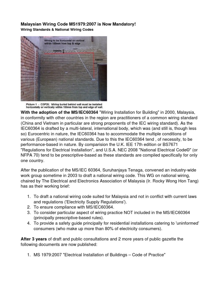 Malaysian standard malaysian standard is a consensus document developed by standards development committees within the malaysian standards development system and approved by the minister of science, technology and innovations in accordance with the standards of malaysia act. Buildings or portions thereof whose peak design rate of electrical energy usage is less than 10w/m2 (installed) of gross floor area for all purposes are excluded from this standard. This electrical installation wiki is a collaborative platform, brought to you by schneider electric: National electrical installation standards are the first quality standards for electrical construction, developed by the national electrical contractors association (neca), in partnership with several. To promote the use of international standards and technical regulations based on internationally established guidelines and risk assessment procedures as provided by